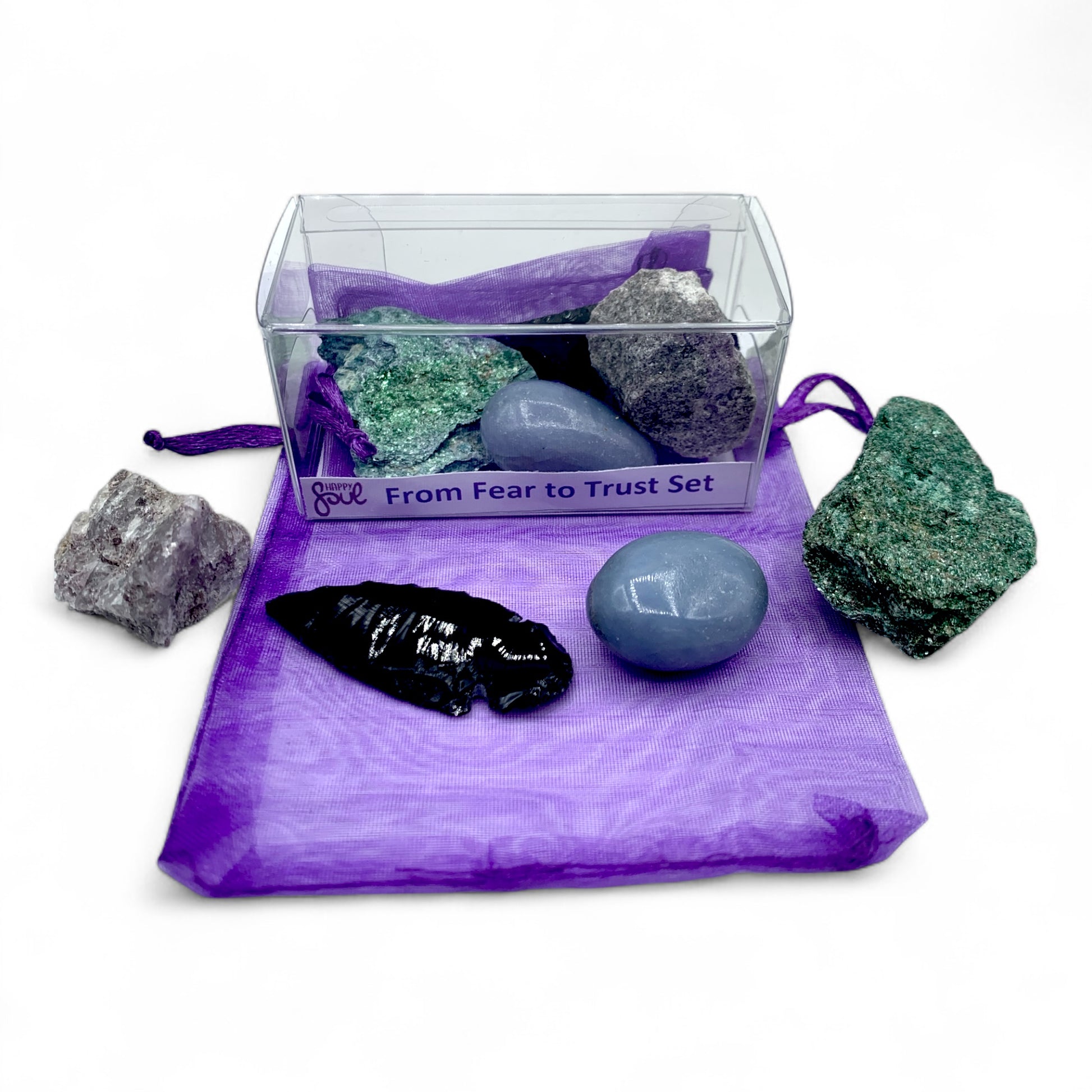 Each From Fear to Trust set includes Obsidian Arrowhead, Fuchsite, Lepidolite, and Angelite.