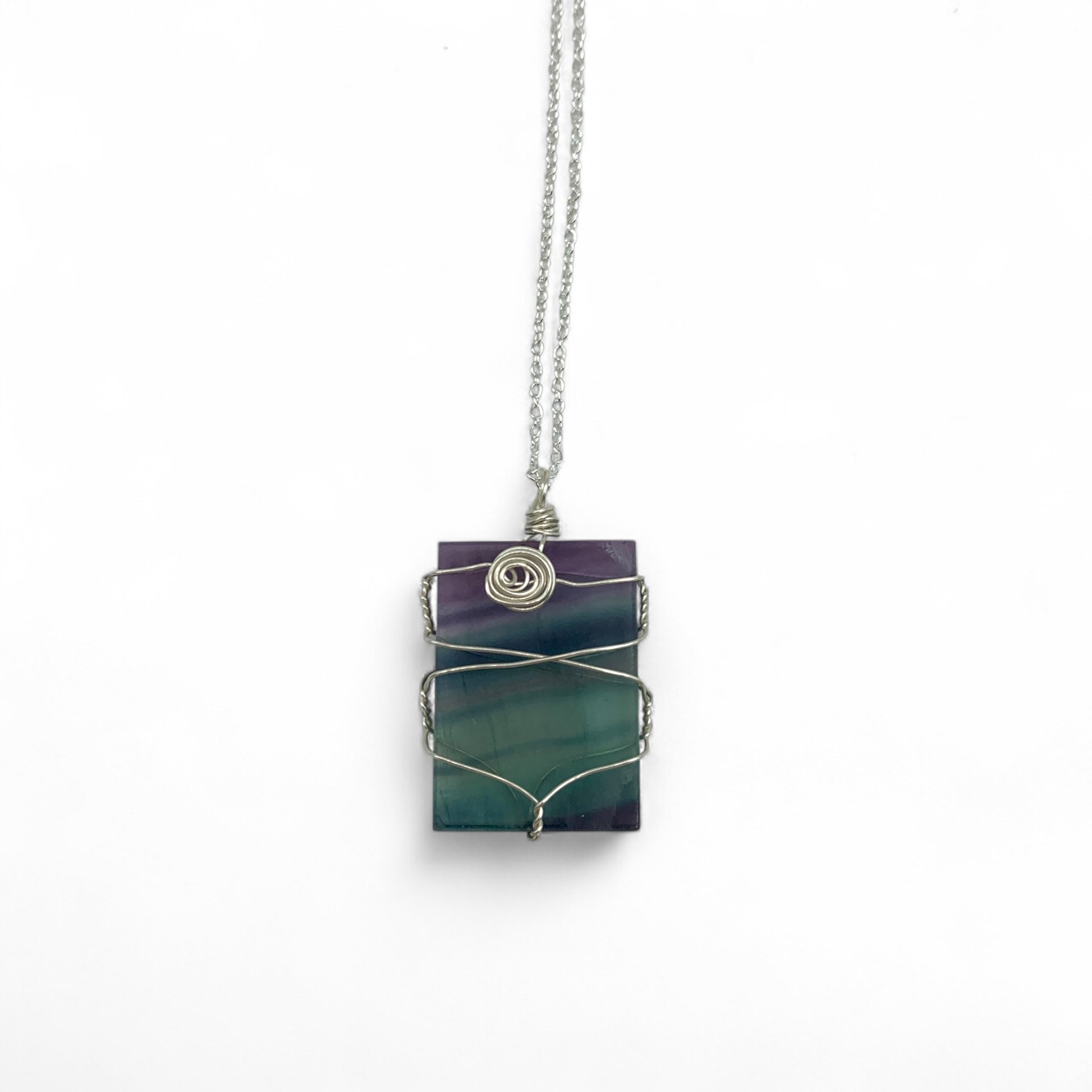 Wire wrapped in silver coloured wire and hung on an 18" silver chain.