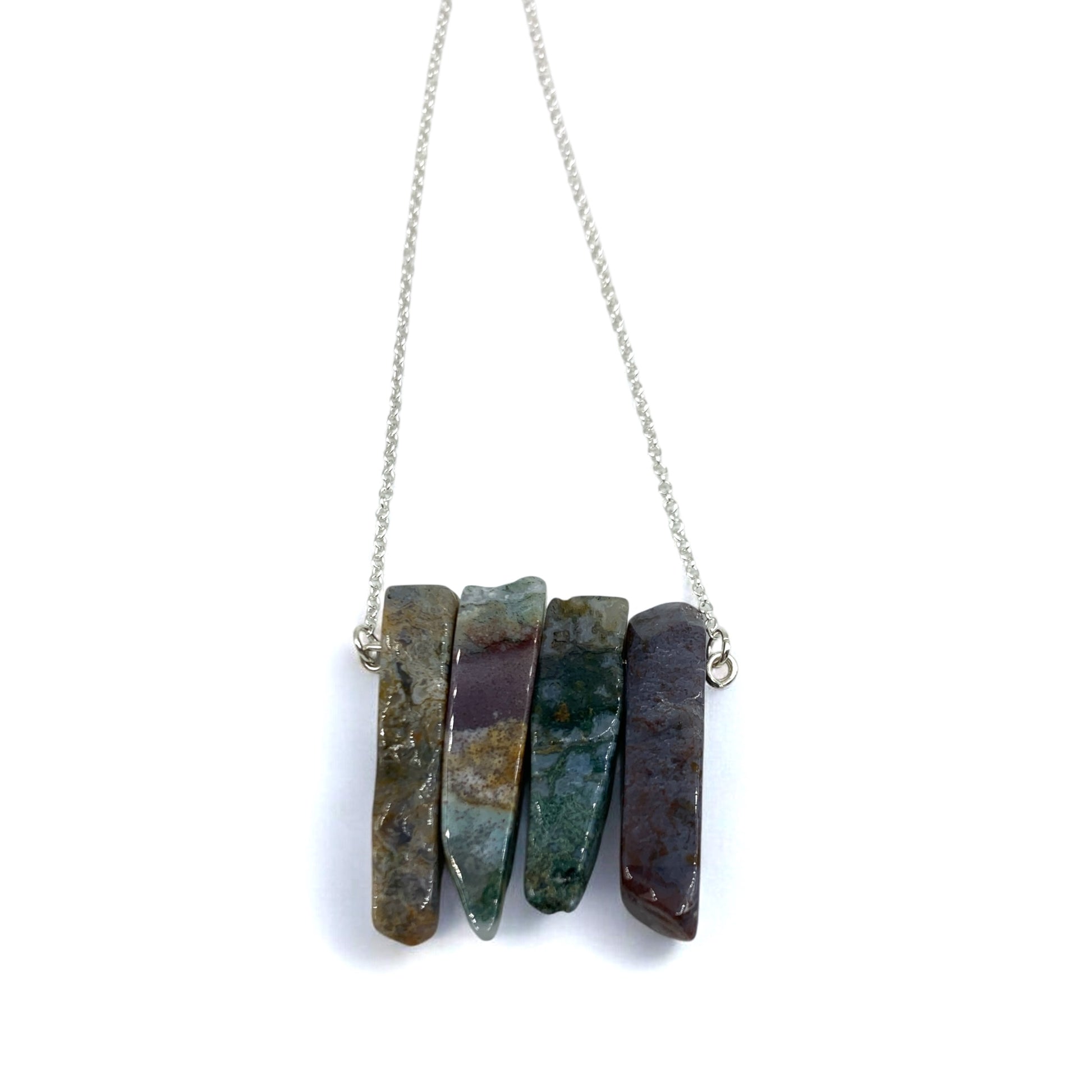 This necklace features four beautiful ocean jasper tumble that's been wire wrapped, and hung from a 26" silver chain.
