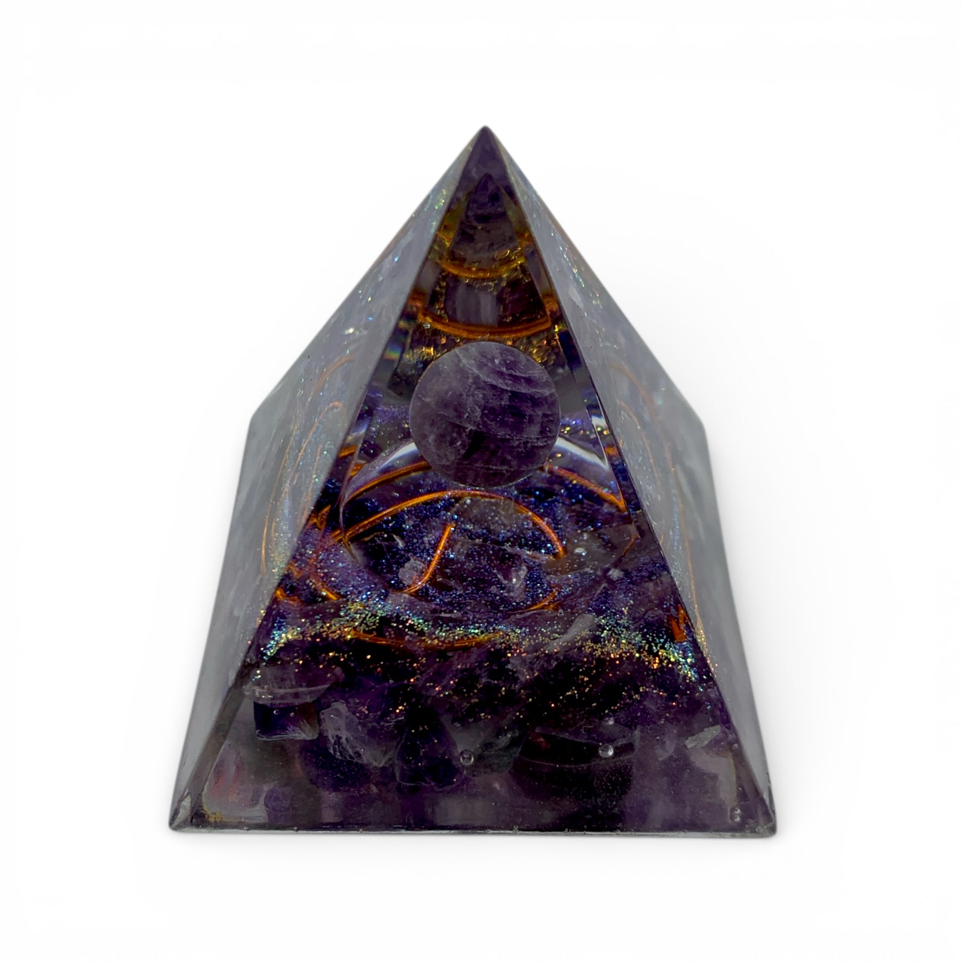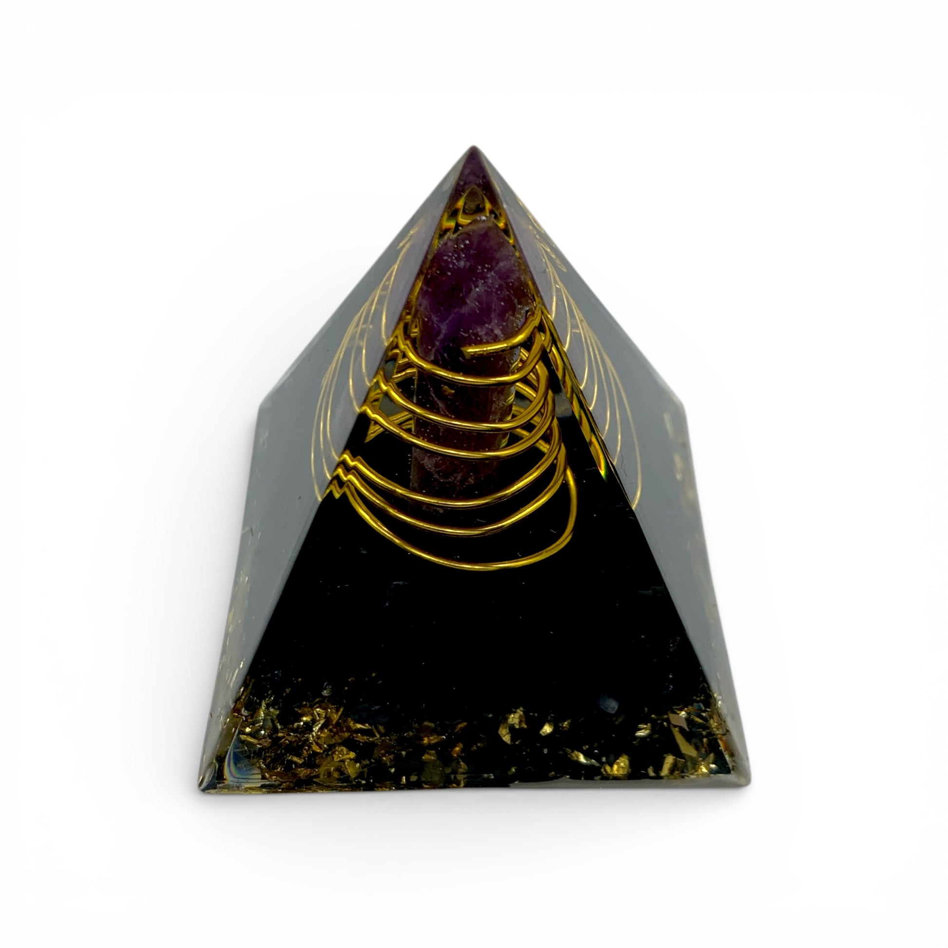 This orgonite offers a powerful balance of protection and spiritual elevation. Black tourmaline grounds and shields, while the amethyst sphere supports intuition and calm. Sacred geometry aligns the energy, and gold flakes enhance the overall vibrational field.